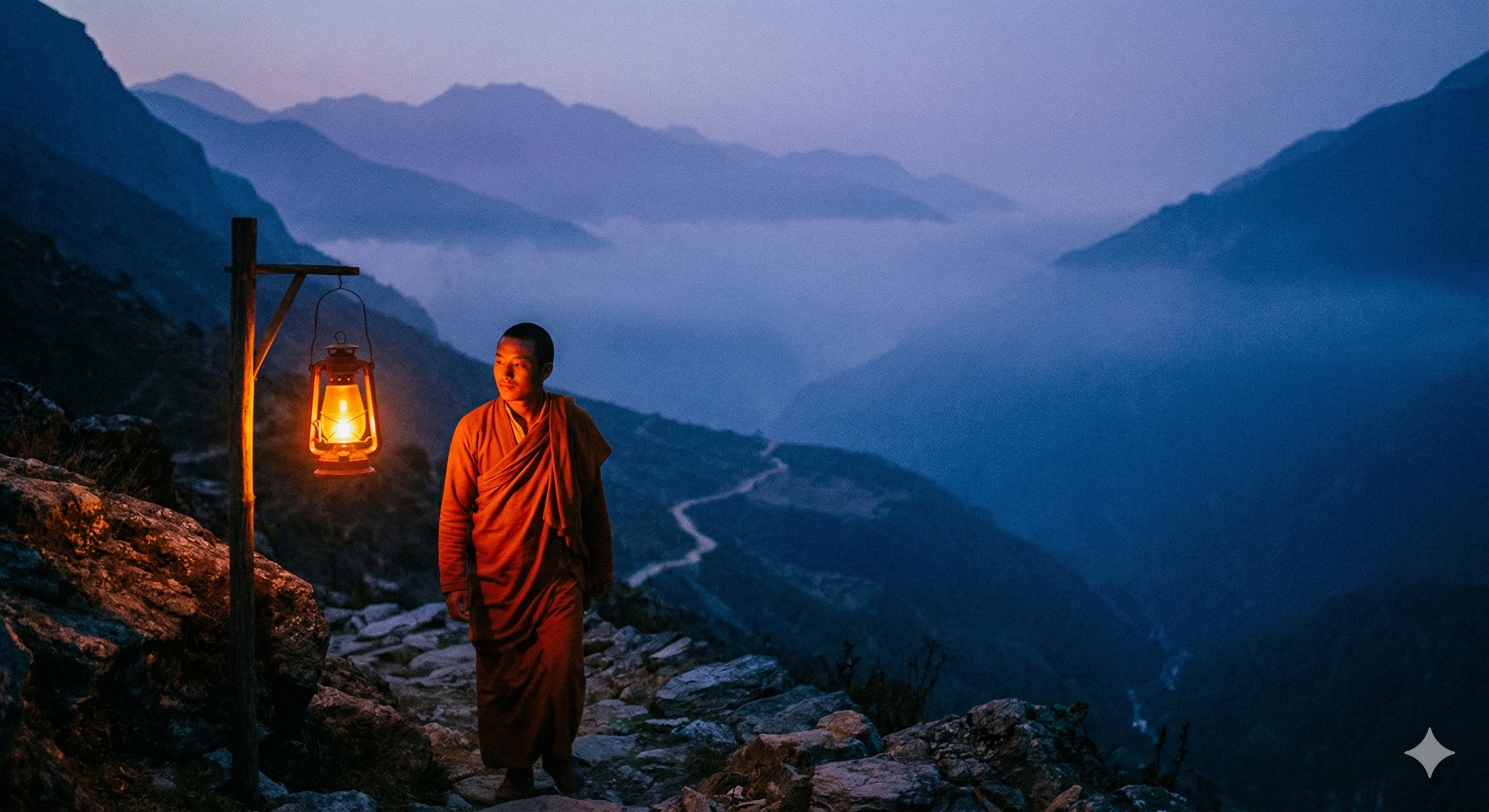 시각적 분석: 위 이미지처럼 푸른 새벽안개 속에 놓인 주황색 등불과 그 앞의 인물. 등불 주변의 따뜻한 공기와 먼 배경의 차가운 안개 대비가 원근감을 극대화함. 전진하는 난색과 후퇴하는 한색의 조화가 만드는 오묘한 깊이감을 확인하세요.