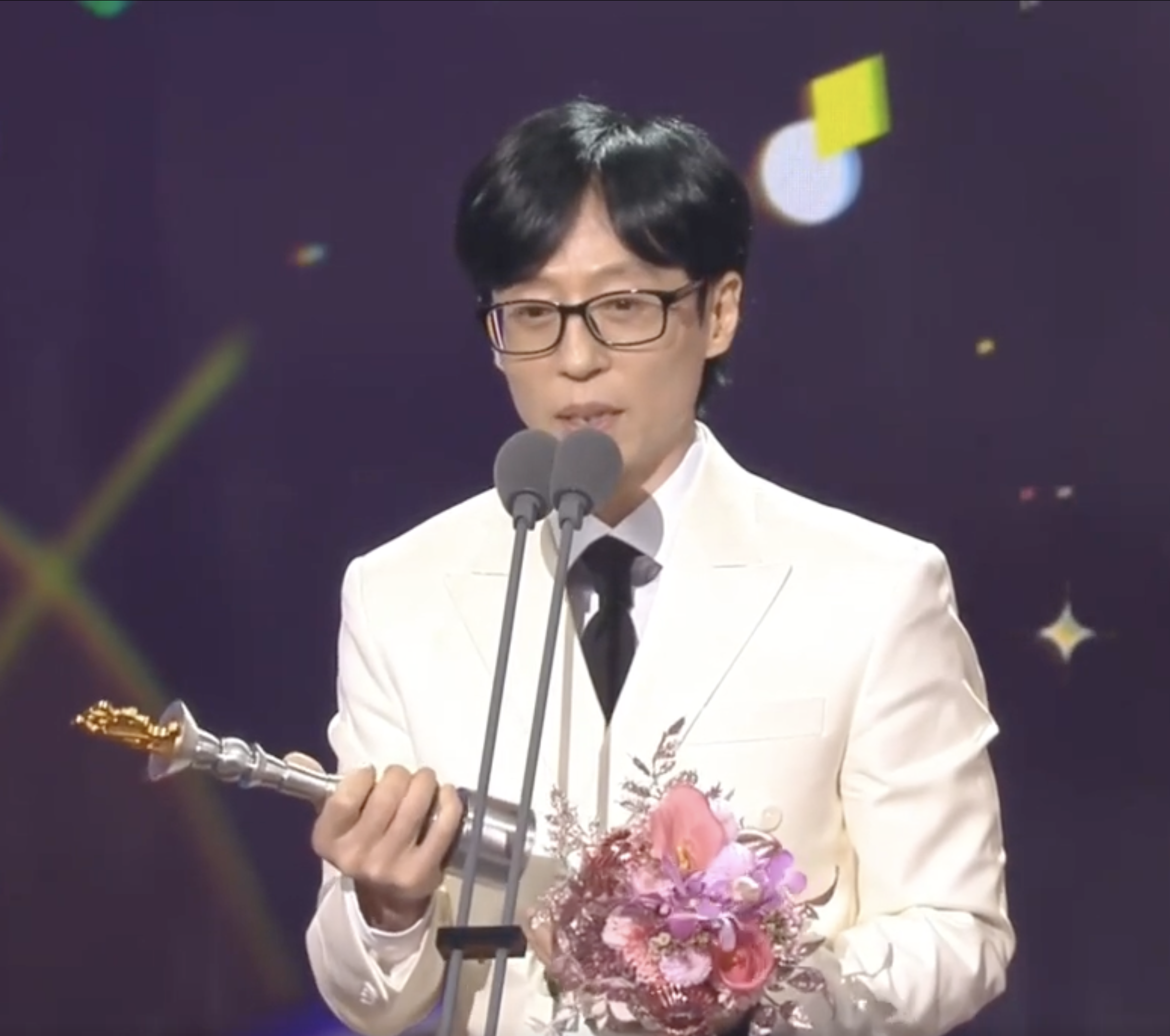 유재석은 수상 소감에서 "이렇게 오래 사랑받을 수 있는 건 모든 스태프, 제작진, 동료 출연자들 덕분입니다. 시청자 여러분이 없었다면 오늘의 저는 존재하지 않았을 것입니다"라고 했어. 늘 겸손한 자세로 동료들과 대중에게 감사하는 모습이 인상적이야.